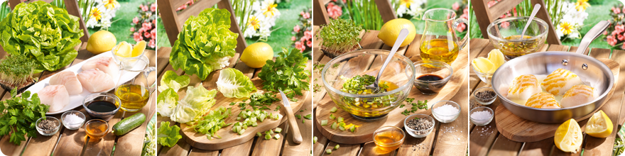 - Salat, Kräuter, Gurke, Öl, Honig und Essig mischen. Die Salsa mit Salz und Pfeffer abschmecken. Kresse vom Beet schneiden und unter die Salsa rühren.